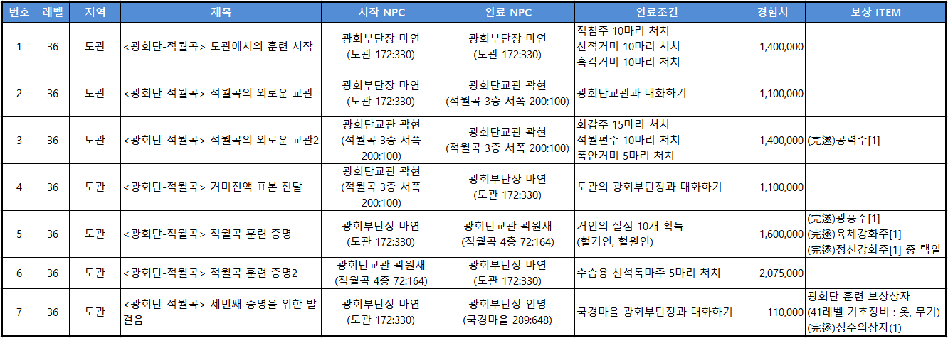 36레벨 광회단 퀘스트는 도관 - 환목림 - 적월곡에서 진행합니다.
